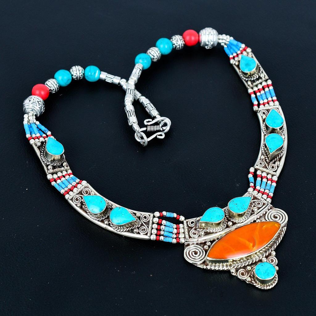Red Coral, Turquoise 925 Silver Necklace Tibetan Silver Necklace Handmade Bead Jewelry Ethnic Jewelry Bohemian Nepali Necklace Elegant Unique Jewelry