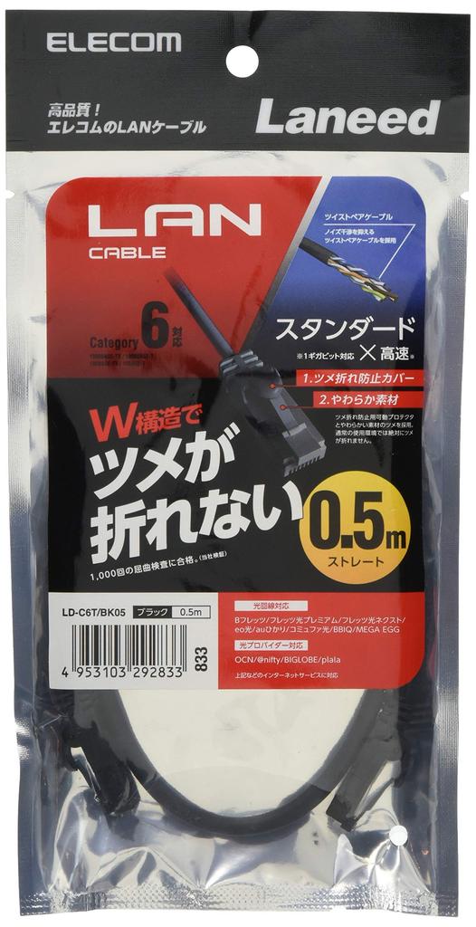 Elecom CAT6 LAN Standard with Connectors LD-C6T/BK05 Cable, 0.5m, Black, Anti-Break