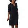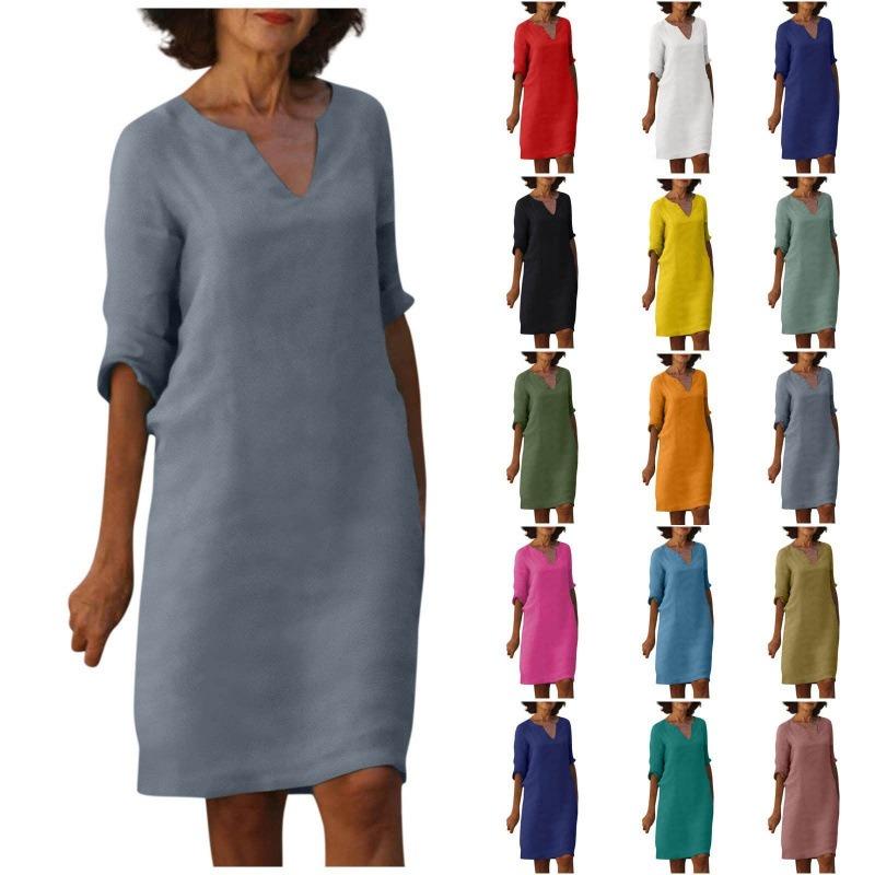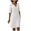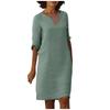 Women Summer Solid Color Cotton Linen Retro V-Neck Short Sleeve Dress Lightweight Breathable Dress
