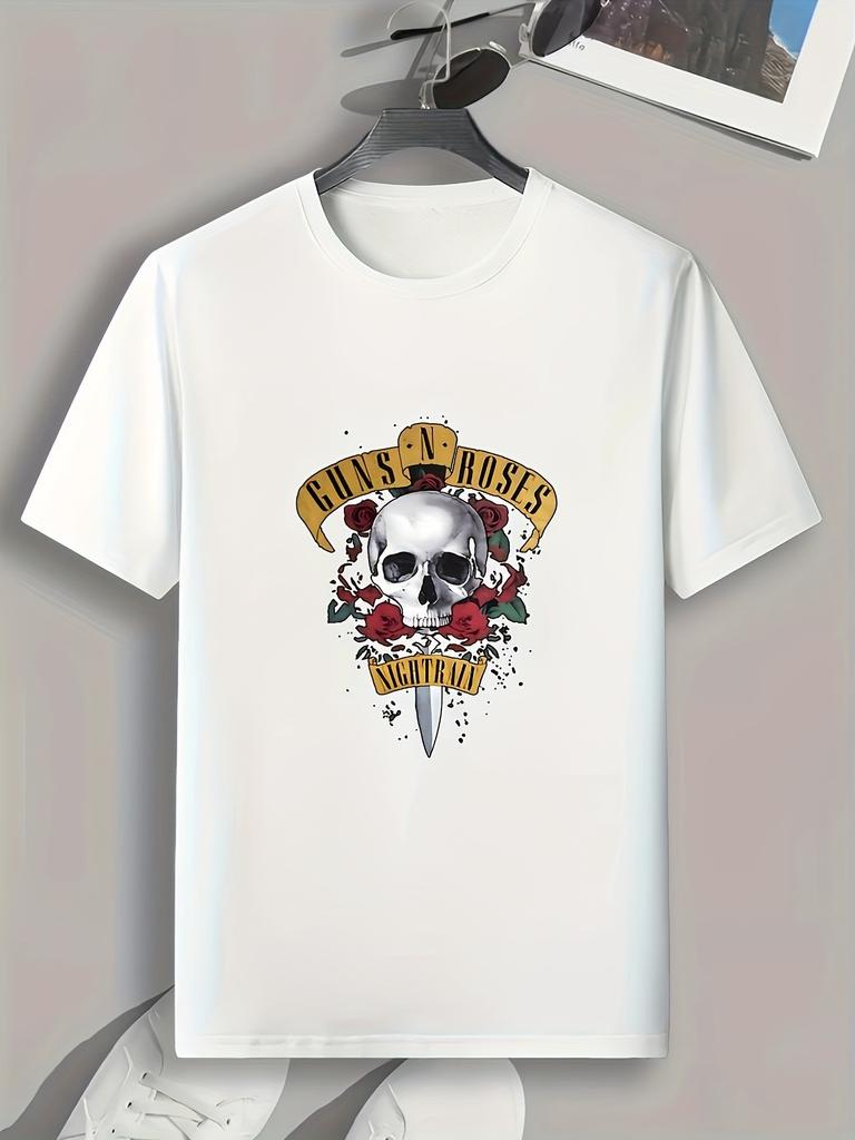 Skull & Rose Print, Men's Graphic Design Crew Neck T-shirt, Casual Comfy Tees Tshirts For Summer