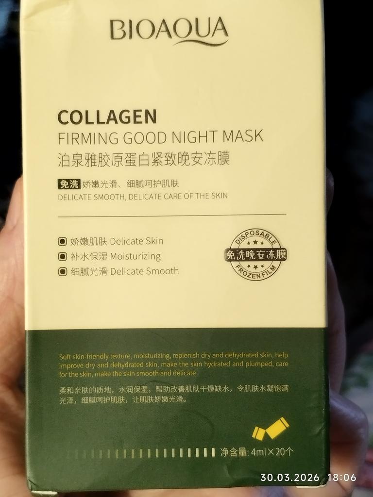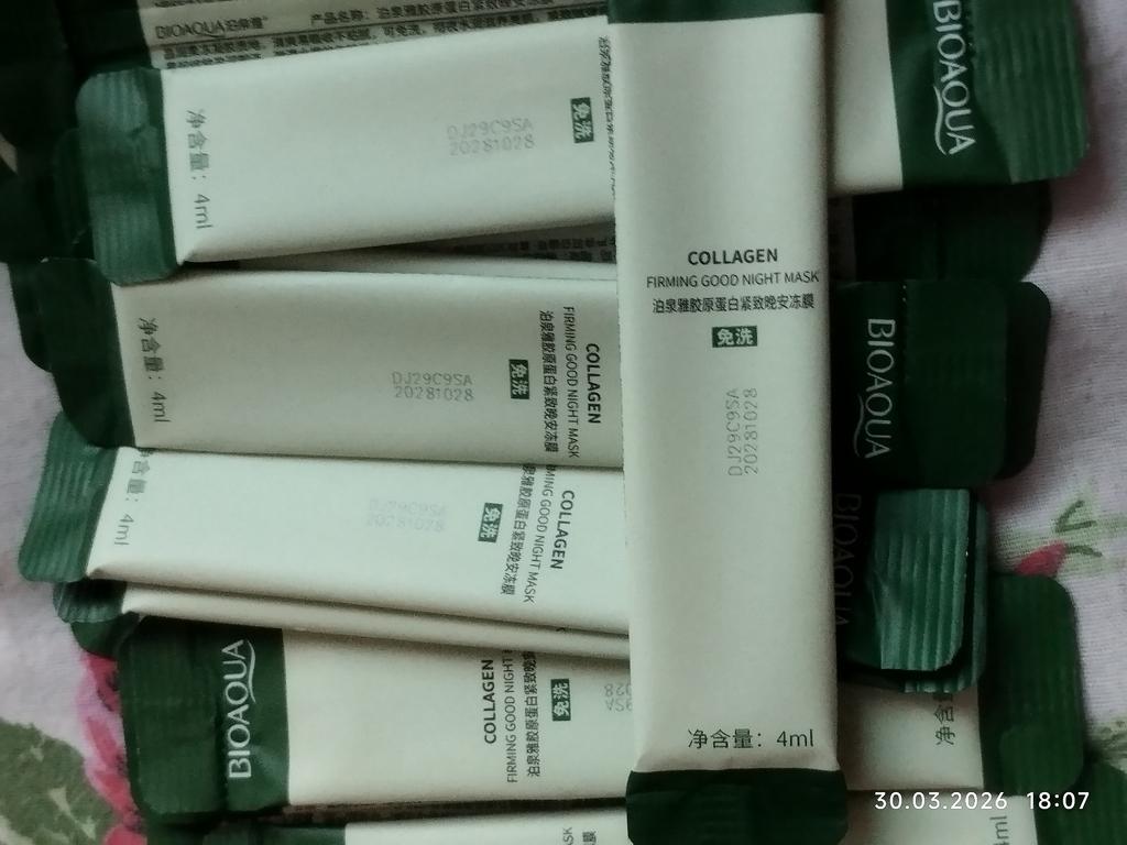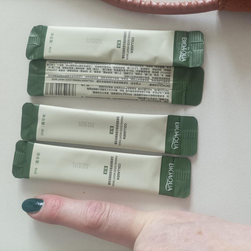 Excellent night face masks Bioaqua with collagen and centella 🧖🏻♀️ At a very advantageous price, especially if you order 20 pieces at once🔥 Skin after application is fresh and hydrated. It is not necessary to use at night. Convenient format - in sticks. I recommend!