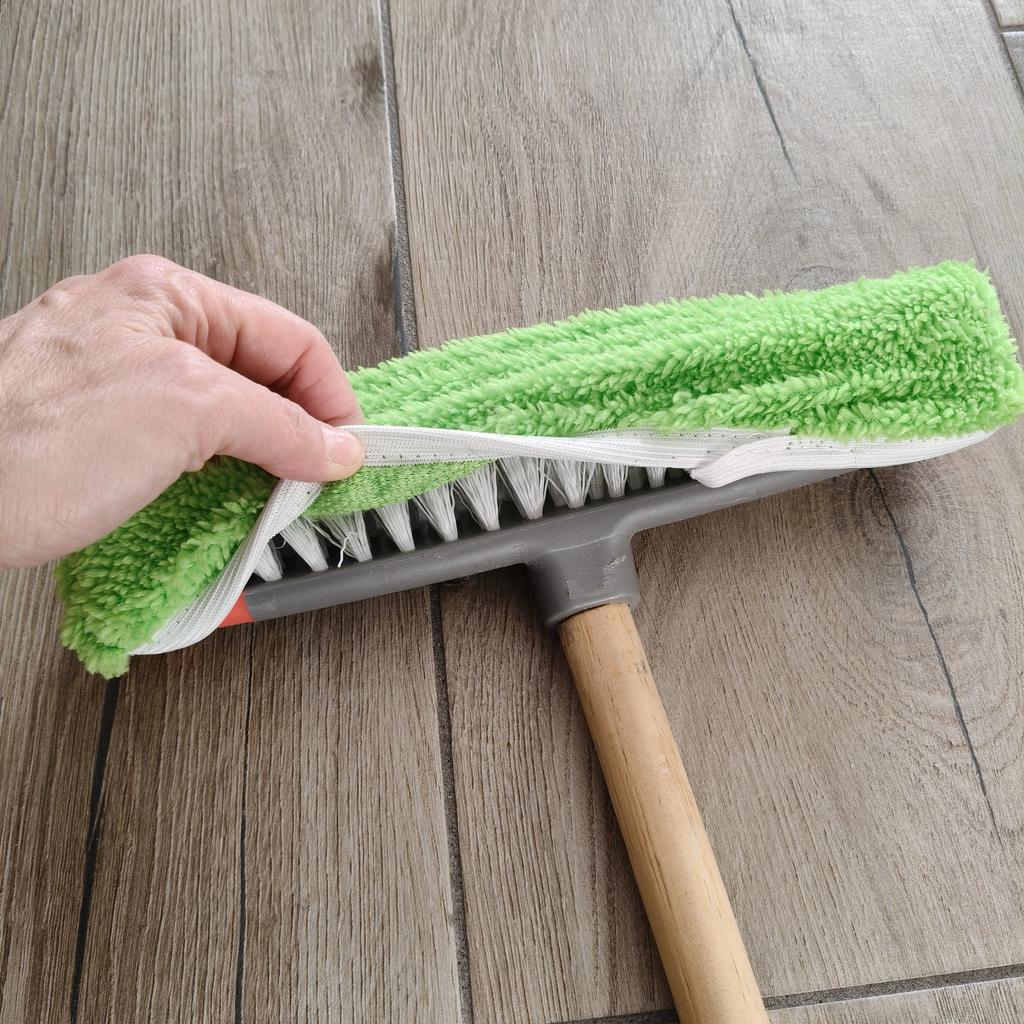 MOP CLOTH arrived in 15 days with tracked shipping. In synthetic material, machine washable Measures 24 cm x 11 cm. I thought it would fit my Vileda Revolution but it's not big enough. It's my fault for not checking the measurements . However, I found out how to use it, on the floor cleaning brush! Recommended purchase 👌