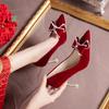 Women's Wedding Shoes New Rhinestone Bow Red Bride High-heeled Female Pointed Toe Slip-on Pumps Nude Shoes
