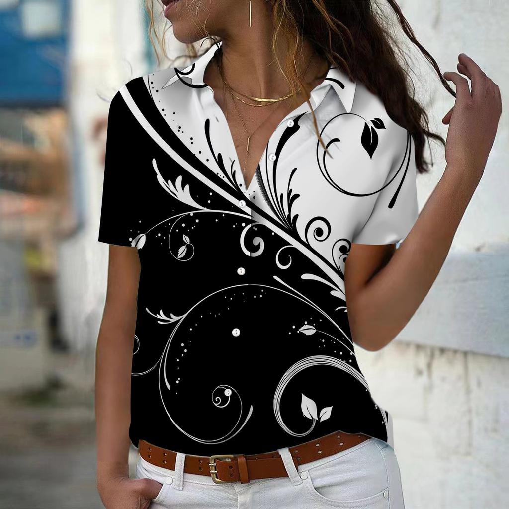 2025 Summer New Fashion Women's Feather Printed Short Sleeve V-neck Casual Button-down Shirt Top
