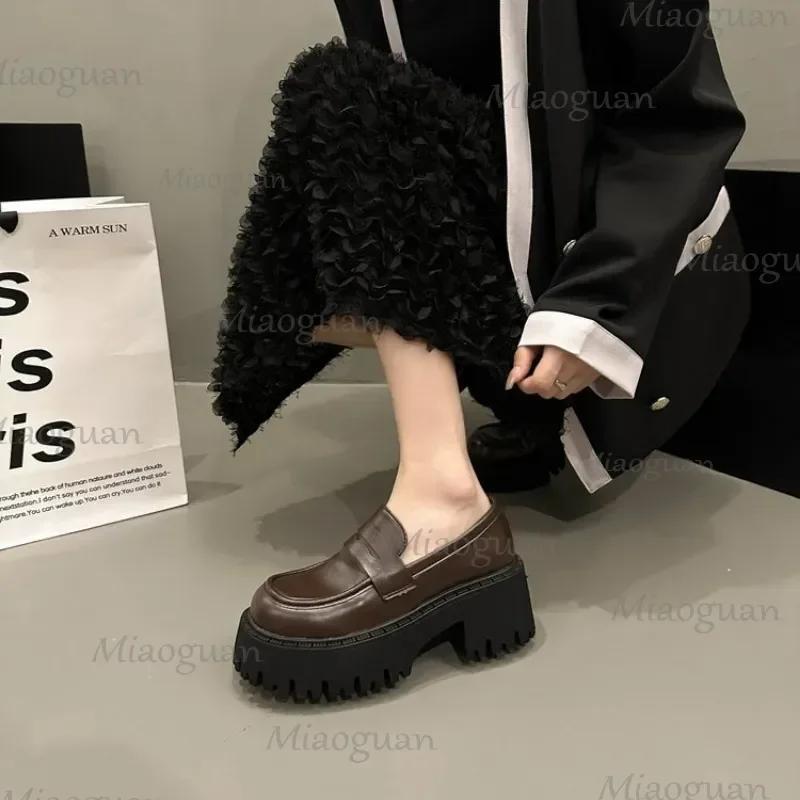 Women Loafers Thick High Heel Shoes Pu Leather Platform British Female Pumps Heightening Brown Slip On Design Punk Lolita Shoes
