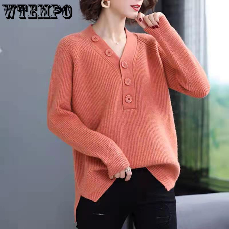Women's V-neck Pullover Sweater Autumn New Style Loose and Thick Single Breasted Knitted Sweater