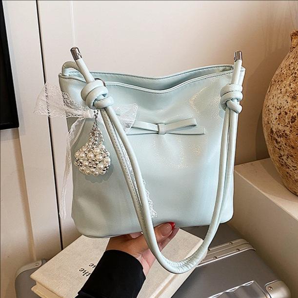 PU Bow - Detailed Bucket Bag with Pendant: Weighing 0.22kg, it has a smooth PU finish, a cute bucket silhouette with a bow accent, and an optional delicate pendant. Perfect for adding a sweet, stylish touch to daily outings, shopping, or casual dates.