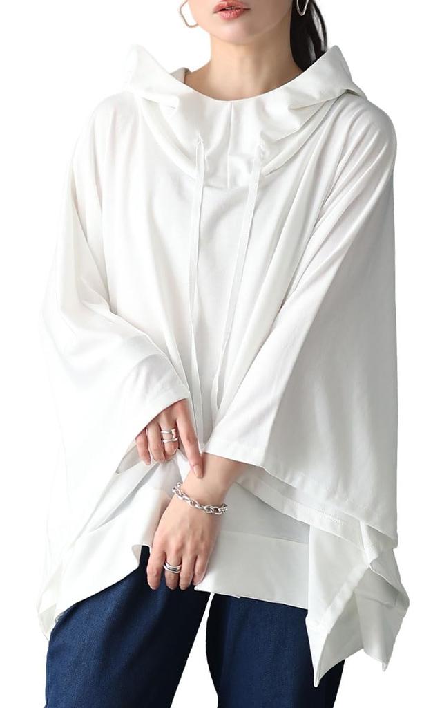 This piece has a large, modified oversized silhouette that spreads out like a cape, giving it a simple yet unique and fashionable look.