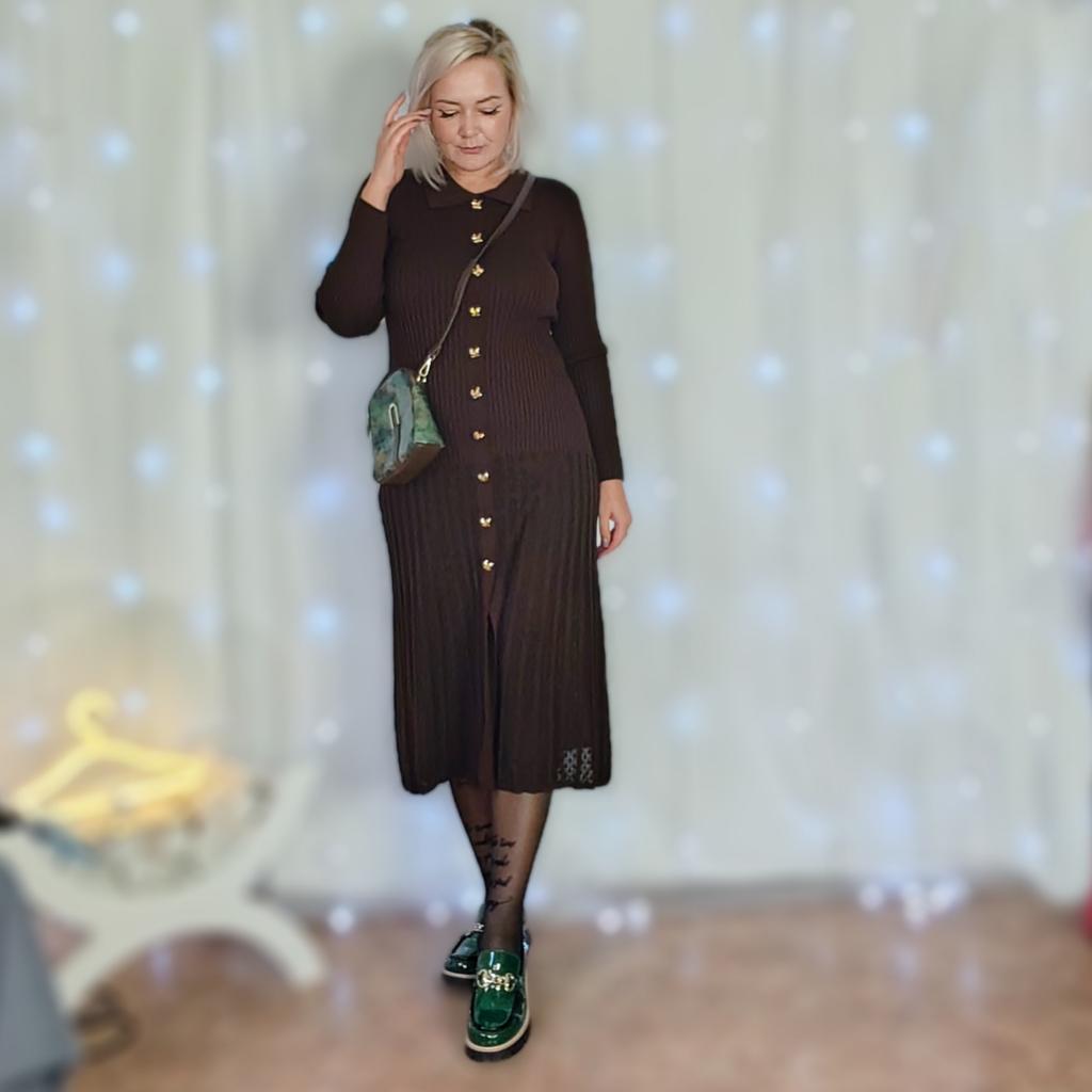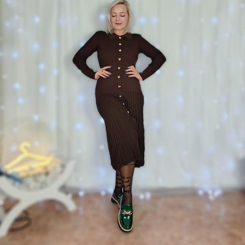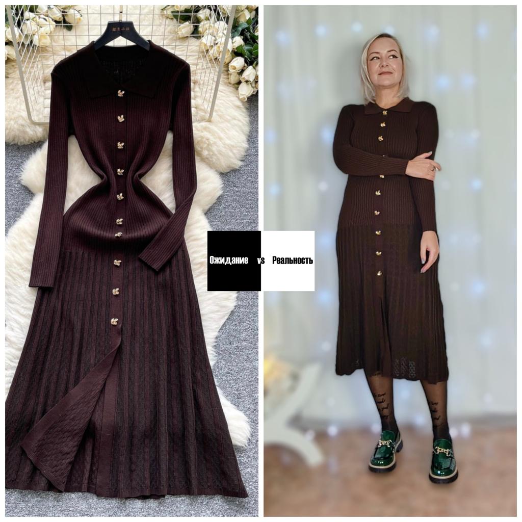 French Retro Turn-down Collar Long Sleeved Metal Buckle Dress for Women's Autumn Slimming Waist Knit Long Dresses