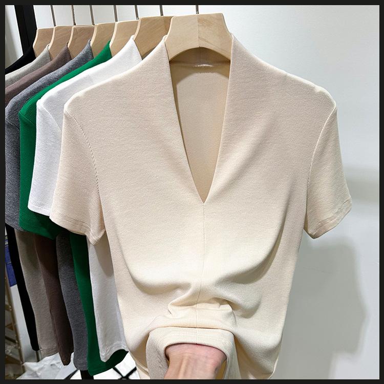 Threaded Fashion V-neck Short-sleeved T-shirt Women's Summer New Slim-fit Half-sleeved T-shirt Top