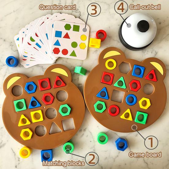 Introducing the shape matching toy, a fun and educational game for children. This toy features building blocks in bright colors and various shapes, all conveniently stored in a box for easy organization. The set includes 2 game boards, 32 matching blocks, 30 question cards, and a bell for quick responses.