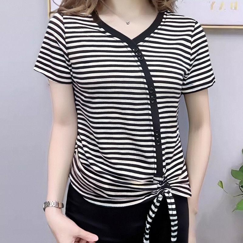 Striped V-neck T-shirt Korean Summer Style Slanted Button Irregular Hem Fashionable Shirt Slim Drawstring Top for Women