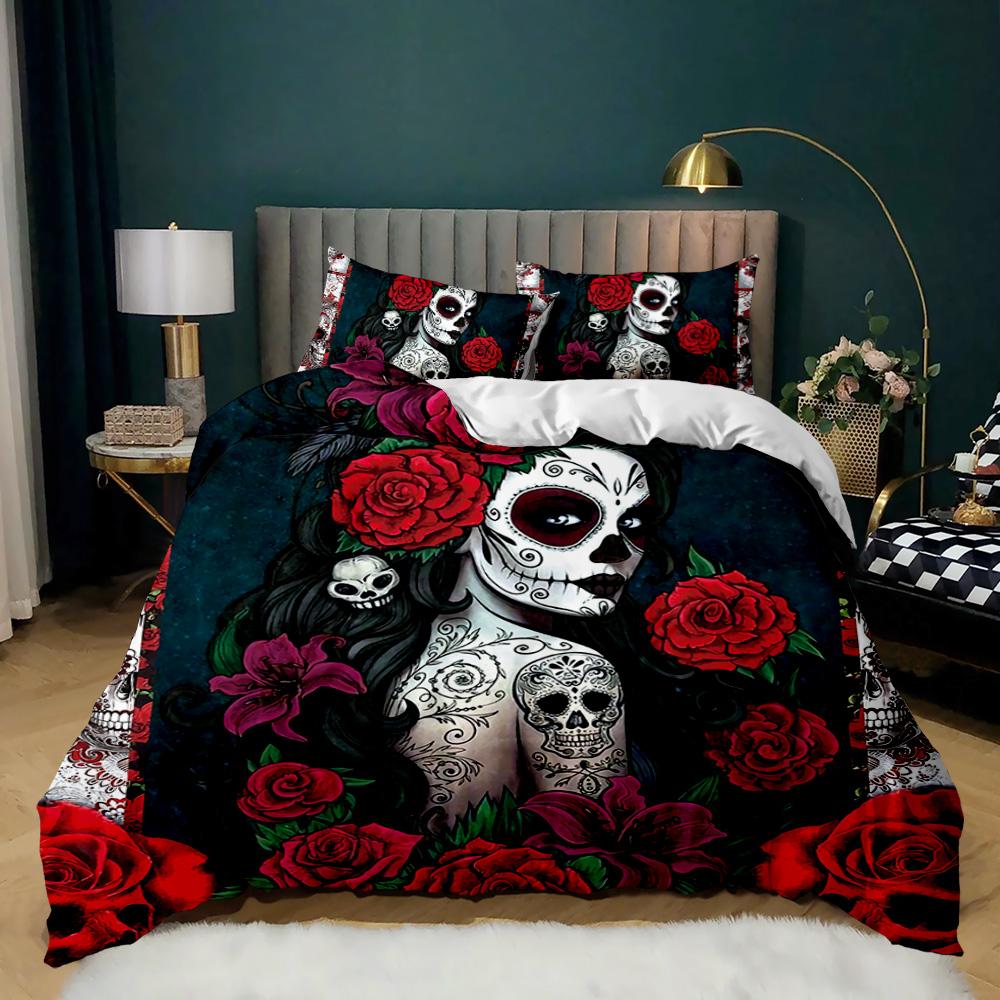 Skull Duvet Cover Red Rose Skeleton Queen Floral Skeleton Traditional Mexican Halloween Double Queen King Qulit Cover