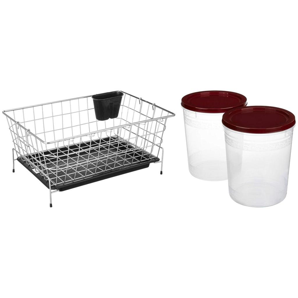Dish Drainer with Drain Tray + Cutlery Stand (54 Cm * 42 Cm * 20 Cm) 2-Piece Kitchen Storage Container Set, 7.5 Litres, Brown Lid, Plastic