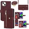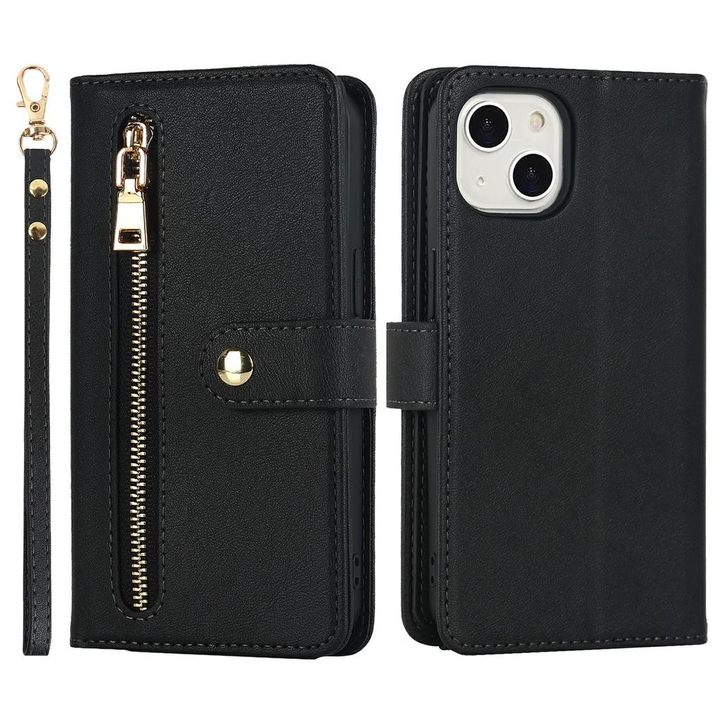 For iPhone 15 Stand Case PU Leather Phone Cover with Straps/Zipper Wallet/Multiple Card Slots