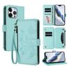 For iPhone 16 Pro Max Leather Case Butterfly Floral Imprint Zipper Wallet Stand Cover with Wrist Strap