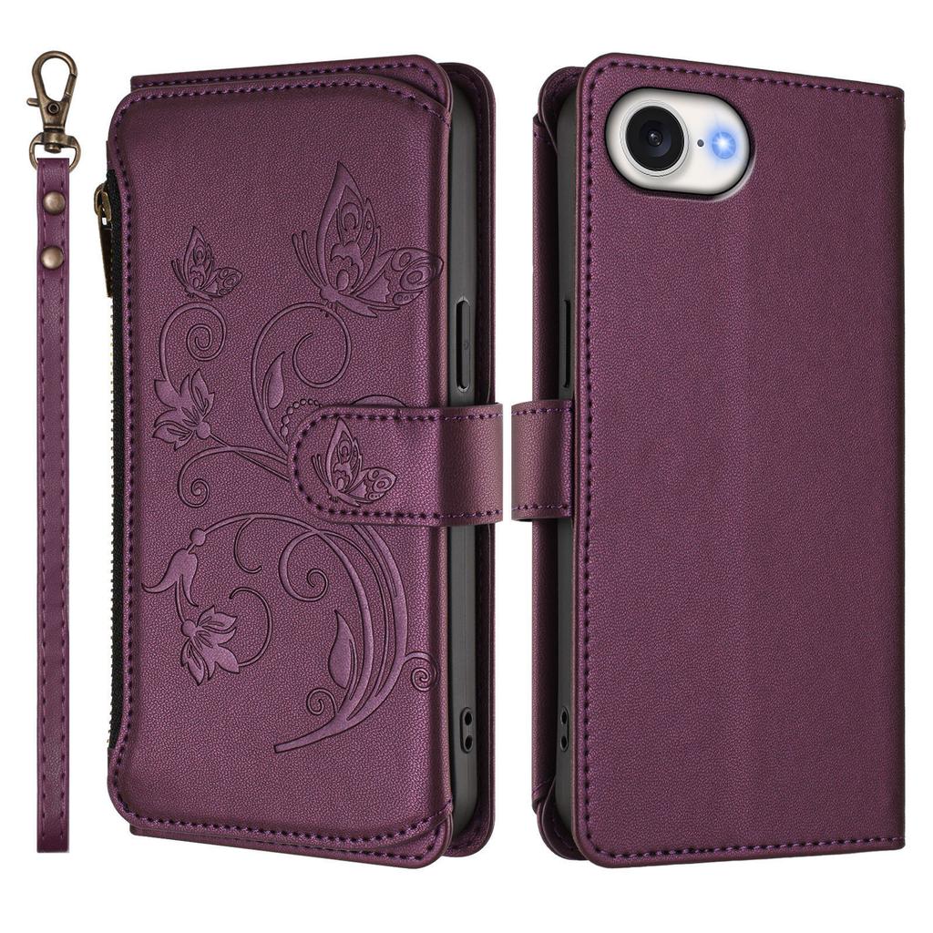 For iPhone 16e Leather Case Butterfly Floral Imprint Zipper Wallet Stand Cover with Wrist Strap