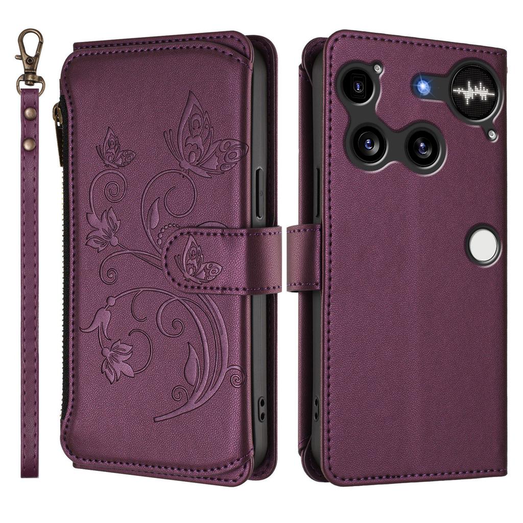 For Nothing Phone (3) 5G Leather Case Butterfly Floral Imprint Zipper Wallet Stand Cover with Wrist Strap
