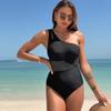 Elevate your swimwear collection with this sophisticated one-shoulder mesh swimsuit, designed with modern European and American fashion trends in mind for 2024. This piece, crafted for women, boasts a sleek and solid pattern, exuding both elegance and style. Made from high-quality nylon material, it ensures a comfortable and flattering fit, perfect for lounging by the pool or making a splash at the beach. The unique asymmetrical design and subtle mesh detailing add a touch of allure, making it a must-have for the fashion-forward.