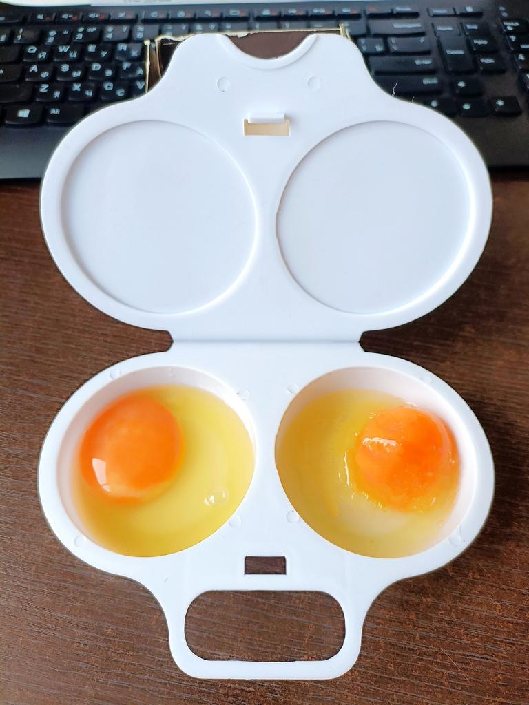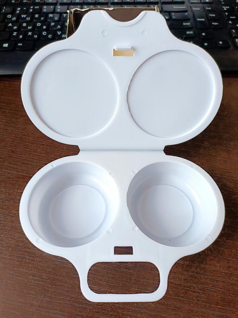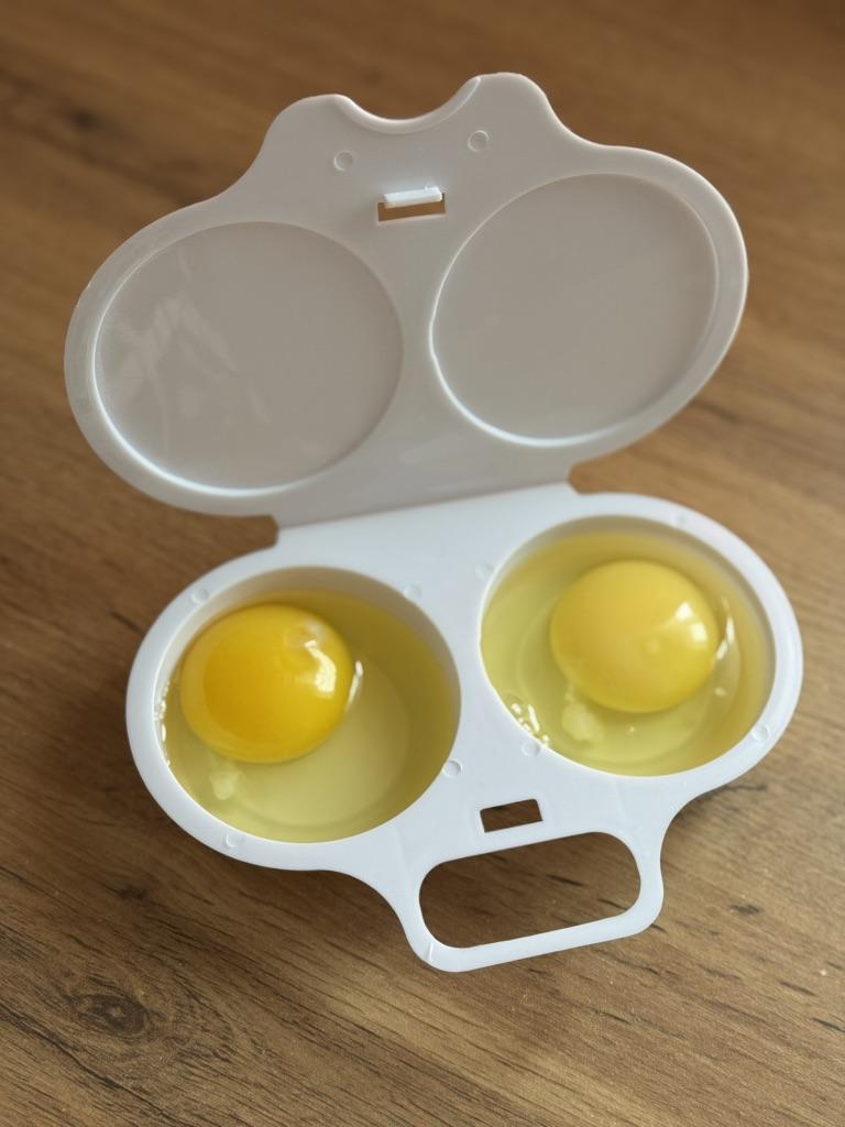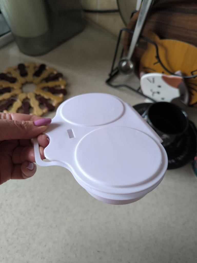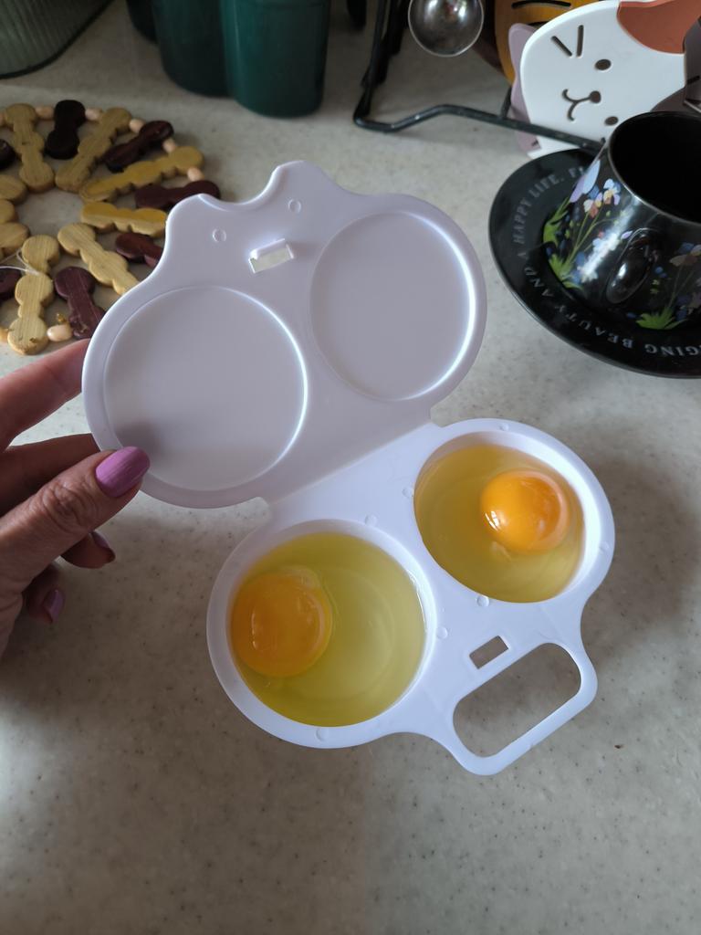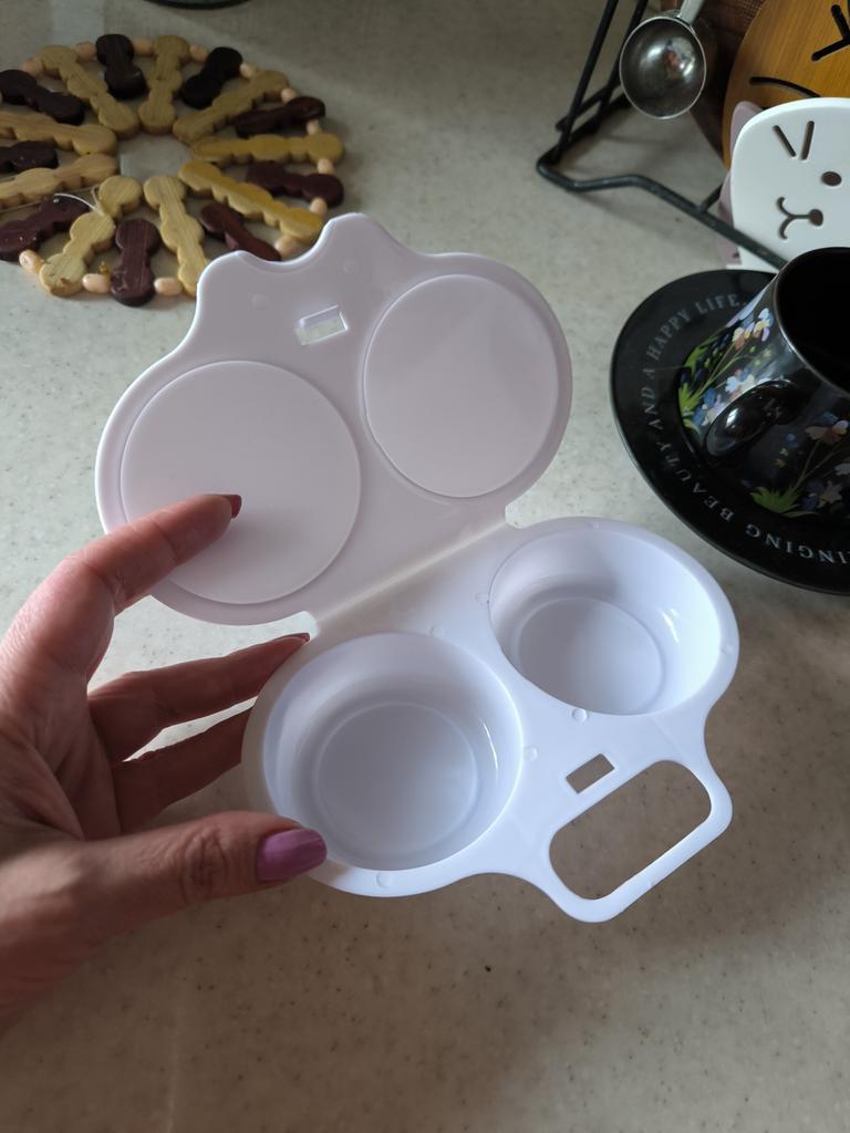 EGG COOKER fantastic microwave egg cooker. A drizzle of extra virgin olive oil, a pinch of salt and in one minute at 800 watts they are ready! Arrived in Italy with tracked shipping in 20 days. Careful packaging. Material: plastic. Snap closure . No defects found. Absolutely recommended purchase 👌