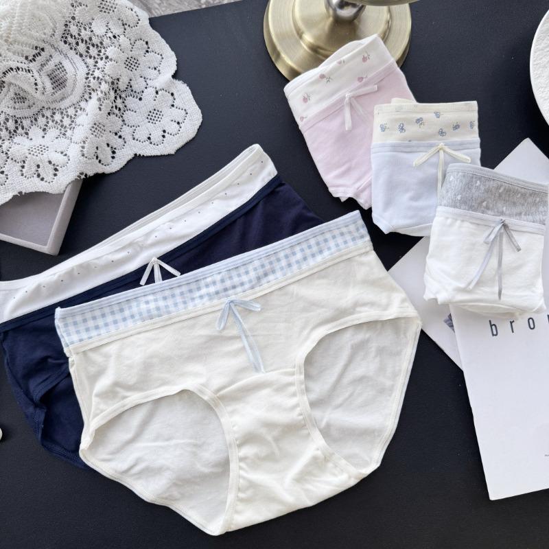 Ladies Spring and Autumn Sweet Contrast Color Cotton Flower Plaid Cute Package Hip Mid Waist Panties