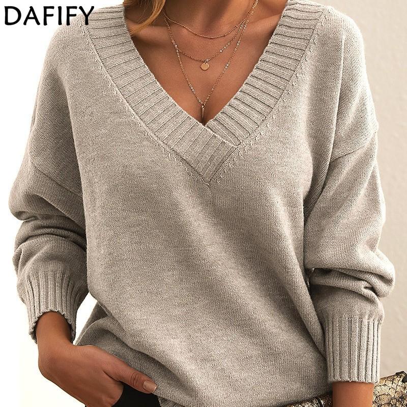 DAFIFY Women's Fashion Casual Fall Winter Solid Color Print Long Sleeve V-Neck Sweaters