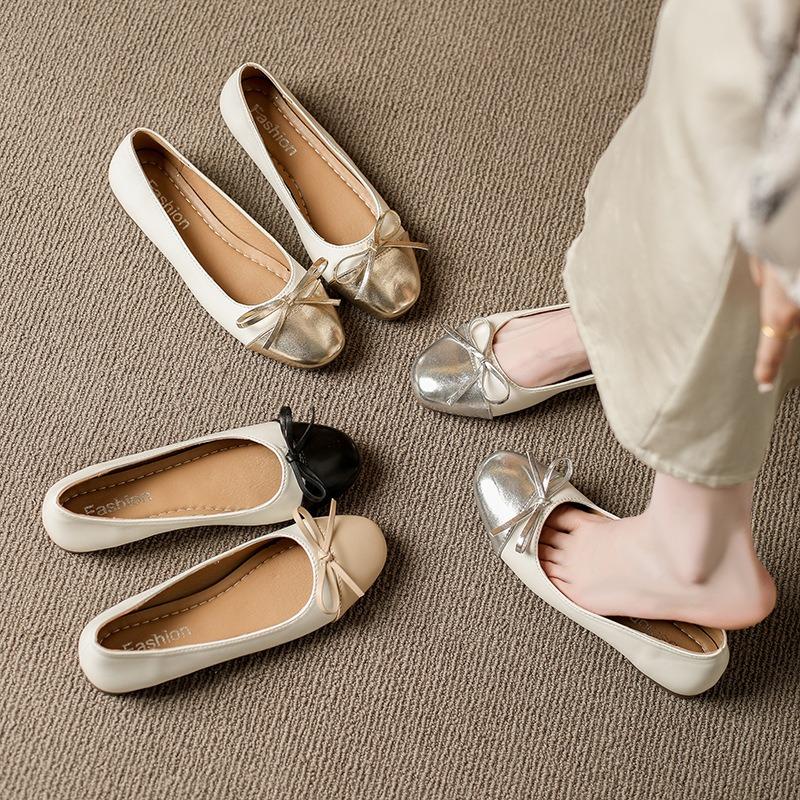 Bow Single Shoes Women's Spring and Autumn New Large Size Round Head Shallow Mouth One Pedal Casual Shoes