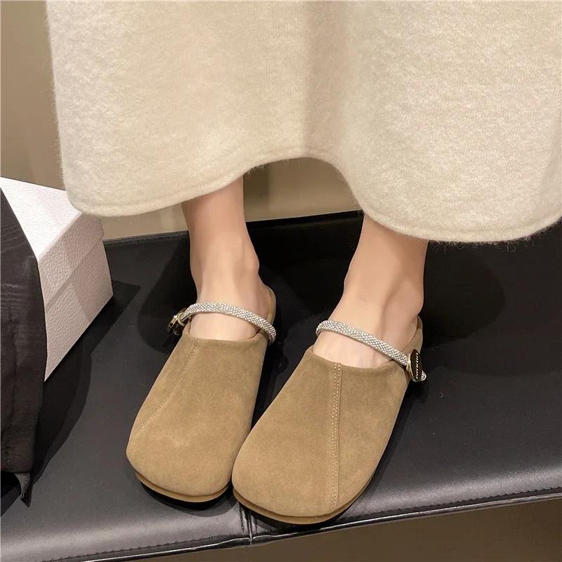 2025 New Women's Mules Flat Sole Solid Rhinestones Cover Toe Slippers Women Dress Metal Decoration Concise Zapatillas De Mujer