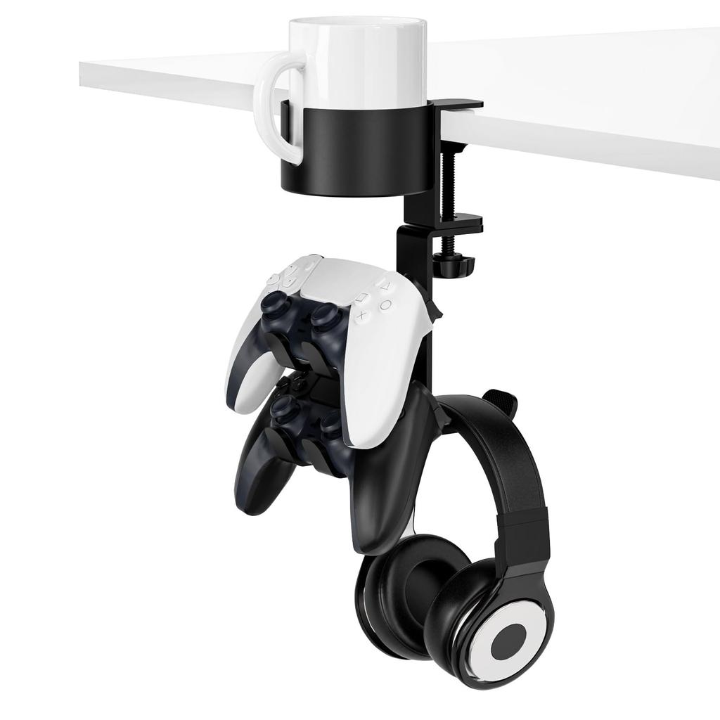 The 3-in-1 Multi-Storage Holder can be hung on a desk top or shelf, allowing you to store headphones and controllers at the same time, even though they tend to be left lying around. It allows you to neatly store your headphones without taking up too much desk space. It's not just for storing basic headphones and controllers; it can also be used to hang cluttered bags and lightweight umbrellas. It can simultaneously store up to two controllers, one pair of headphones, and one cup.