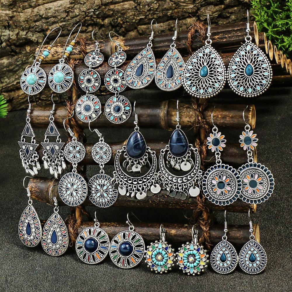 Blue New Alloy Earrings Turquoise Inlaid Bohemian Retro Geometric Round Multi Layered Design Vacation Party Versatile