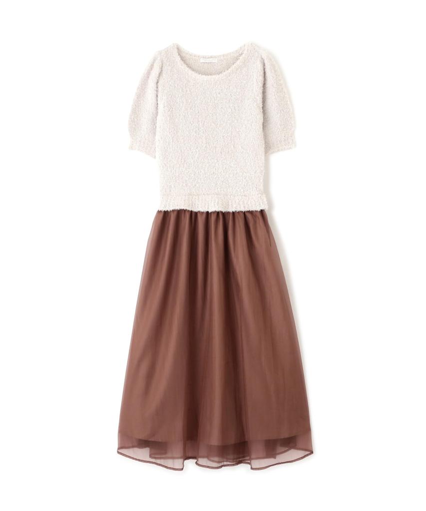 This dress features a sheer skirt paired with a tape yarn knit in autumnal colors. The knit is made with textured yarn, making it a trendy piece this year, and the elastic waist makes it easy to put on and take off. It can be easily coordinated with pumps, loafers, and even boots. A single piece will complete a seasonal outfit.