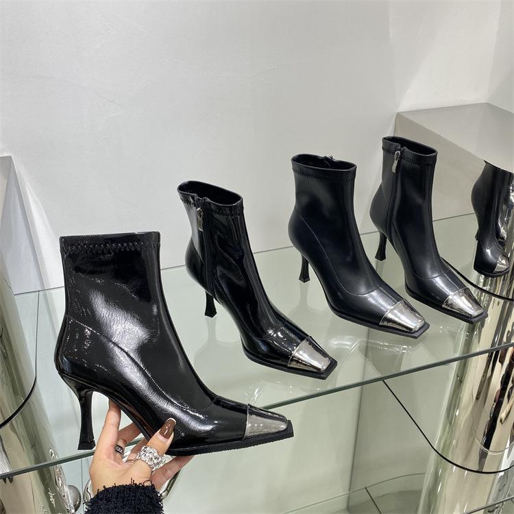 Autumn and Winter Fashion Side Zipper Boots European and American Style Metal Square Head Women's Boots Fine Heel High Heel Short Boots Women