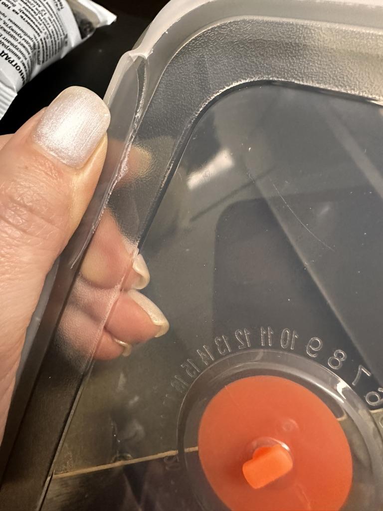 The plastic lid is cracked at the edge, a piece has broken off