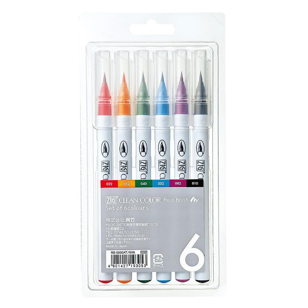 Kuretake Zig Clean Color Real Brush Pens, Set of 6 - Vibrant Colors, Flexible Brush Tips for Watercolor Effects