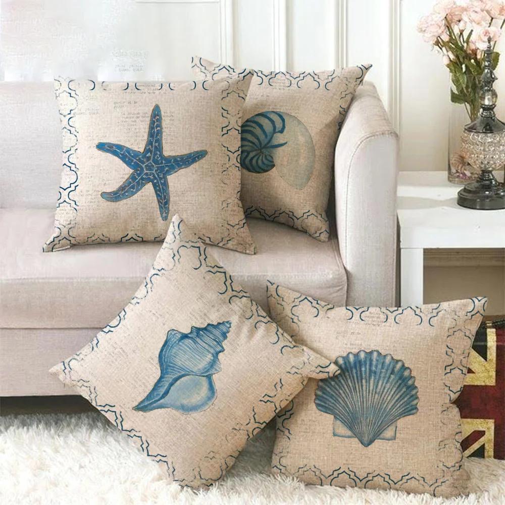Shellfish Pillow Covers Beach Starfish Seashell Ocean Throw Pillow Case Bedroom Home Decor Cotton Linen Cushion Cover 18x18 Inch