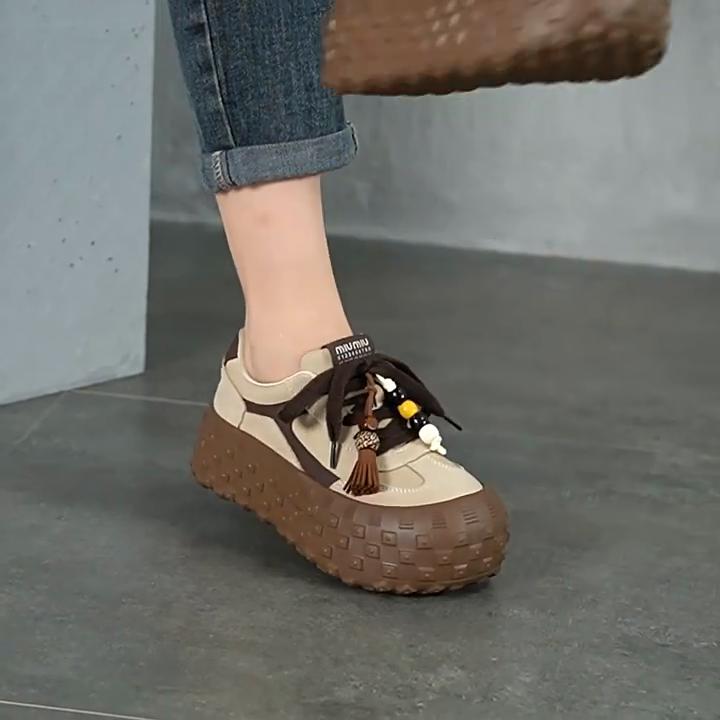 Johnature Genuine Leather Casual Lace Up Shoes Lightweight Thick Soled Height Increasing Women's Platform Shoes