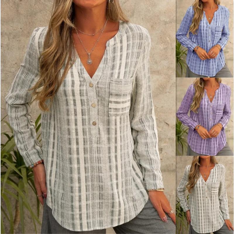 Women Shirts Fashion 2025 Spring Autumn Style Blouses Lady Casual Long Sleeve V-Neck Striped Printed Pockets Casual Loose Tops