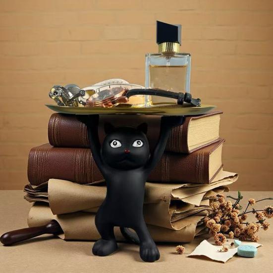 Cartoon Cat Key Storage Tray Resin Standing Cat Figurine Statue with Tray Multi-purpose Jewelry