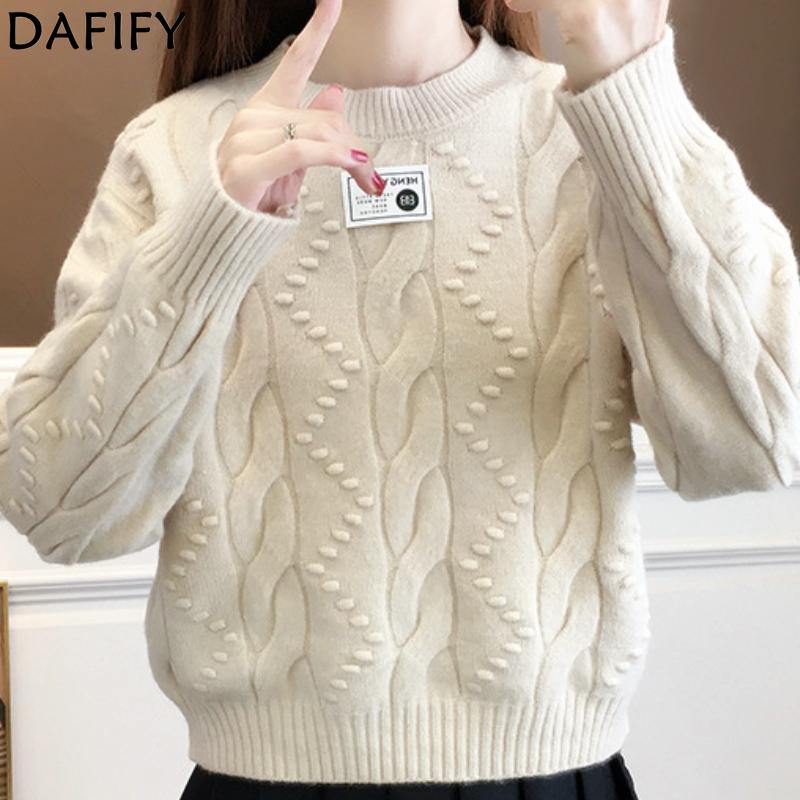 DAFIFY Women's Fashion Casual Fall Winter Solid Color Print Long Sleeve O-Neck Sweaters