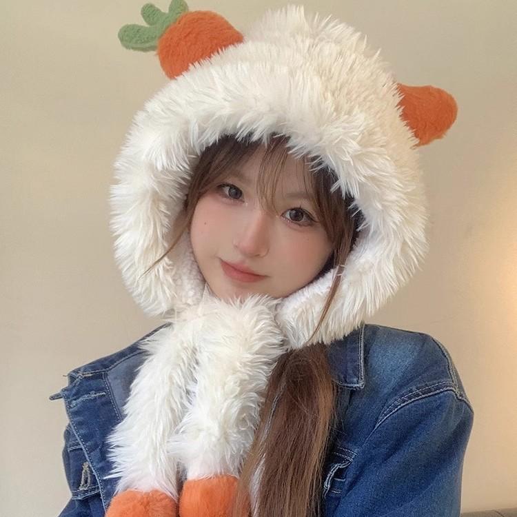 Carrot Plush Strap Lei Feng Hat for Women In Autumn and Winter New Thickened Warmth and Cold Protection Ear Protection Versatile Pullover Hat Cute