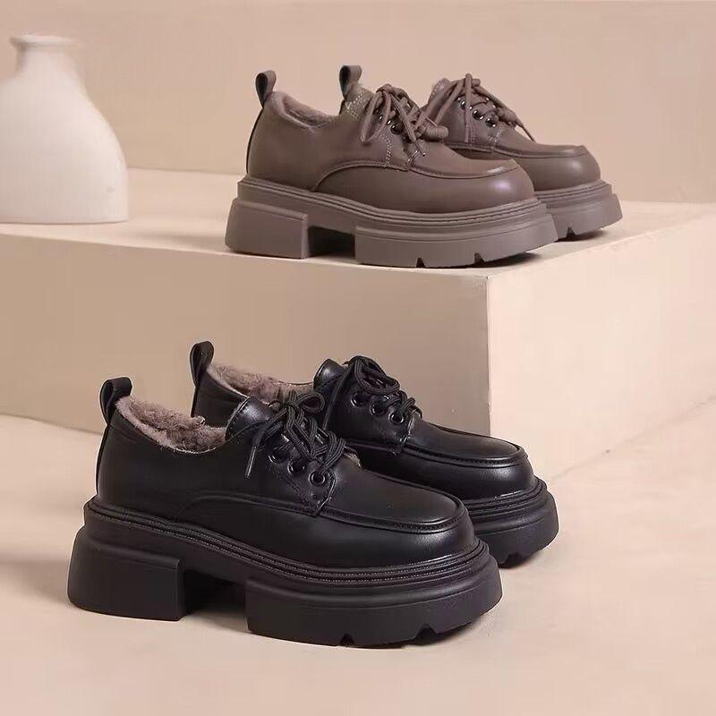 British Style Platform Lace-up Small Leather Shoes Women's 2025 Winter New Retro Versatile Velvet Platform Heightening Loafers