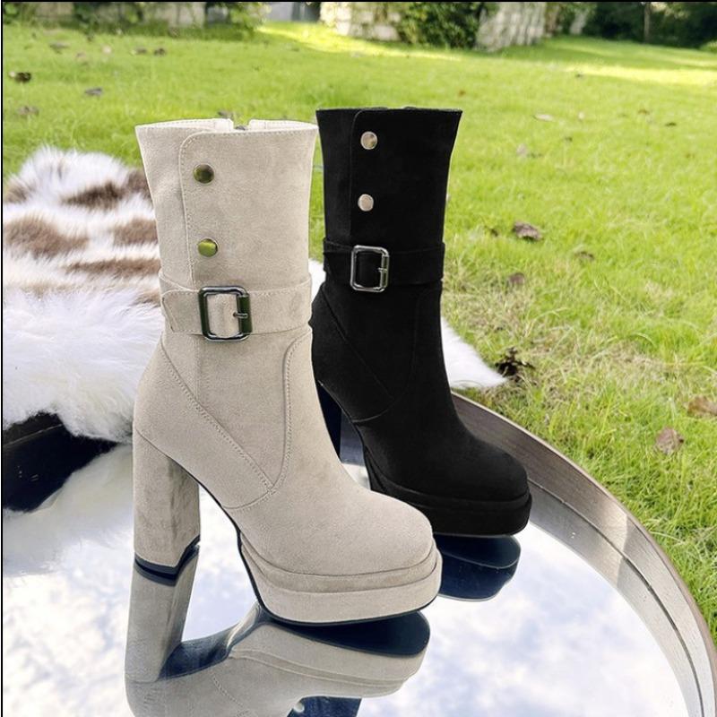 Fashion Vintage Platform Thick High Heel Women Mid-Calf Boots Fashion Slip On Autumn Winter Female Western Short Booties Botas De Mujer