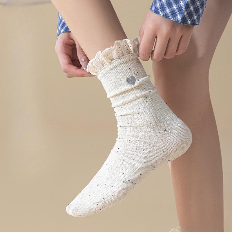 Female Autumn and Winter Love Embroidered Lace Breathable Sweat Absorbent Tube Pile Pile Cotton Socks