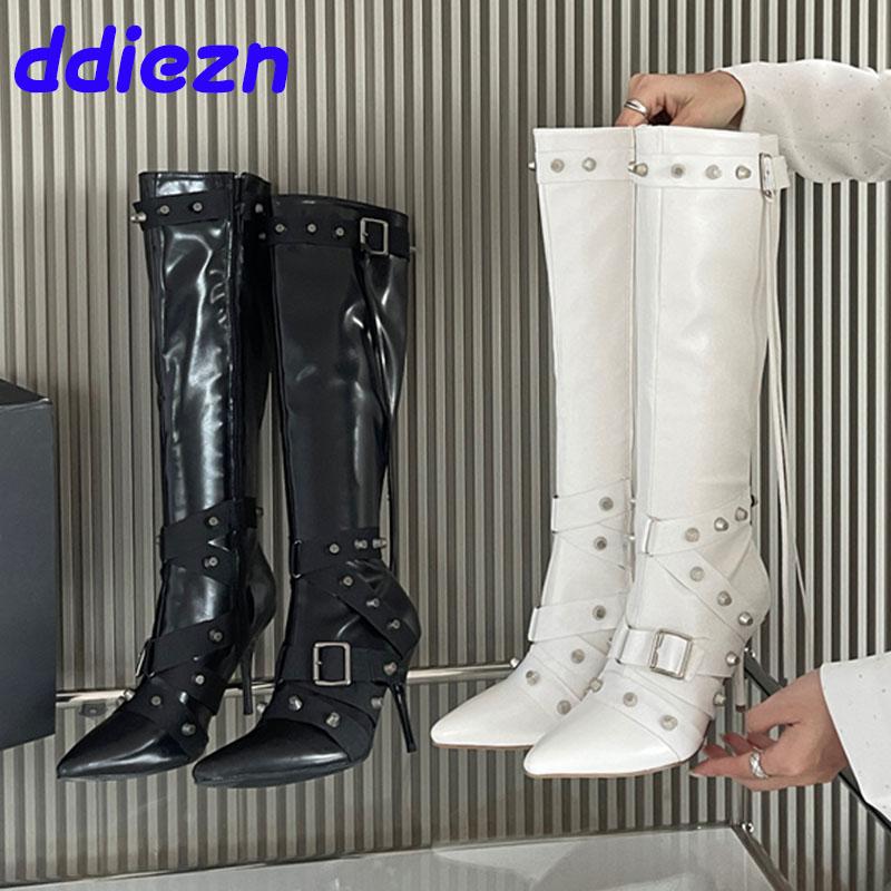 Fashion Fashion Rivet Ladies Knee High Boots With Thin Heels Female Zippers Shoes Footwear Pointed Toe Women Long Modern Boots Shoes