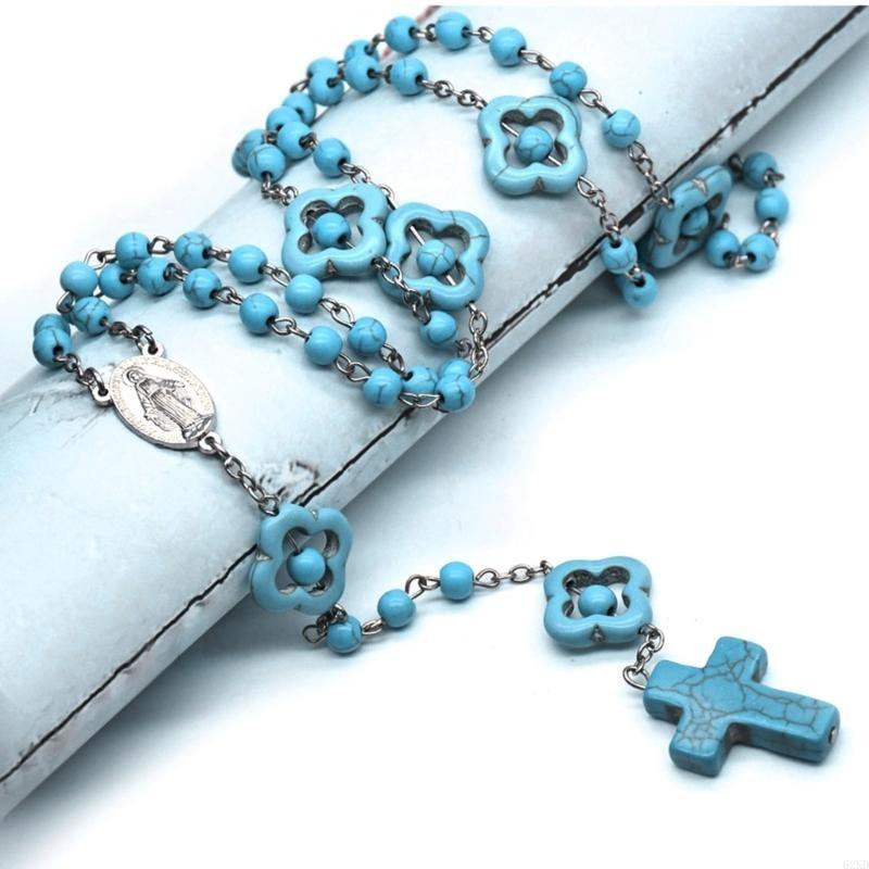 62KD Catholic Turquoise Rosary Necklace Mary Charm Round Bead for Cross Necklaces Religious Praying Fashion Jewelry