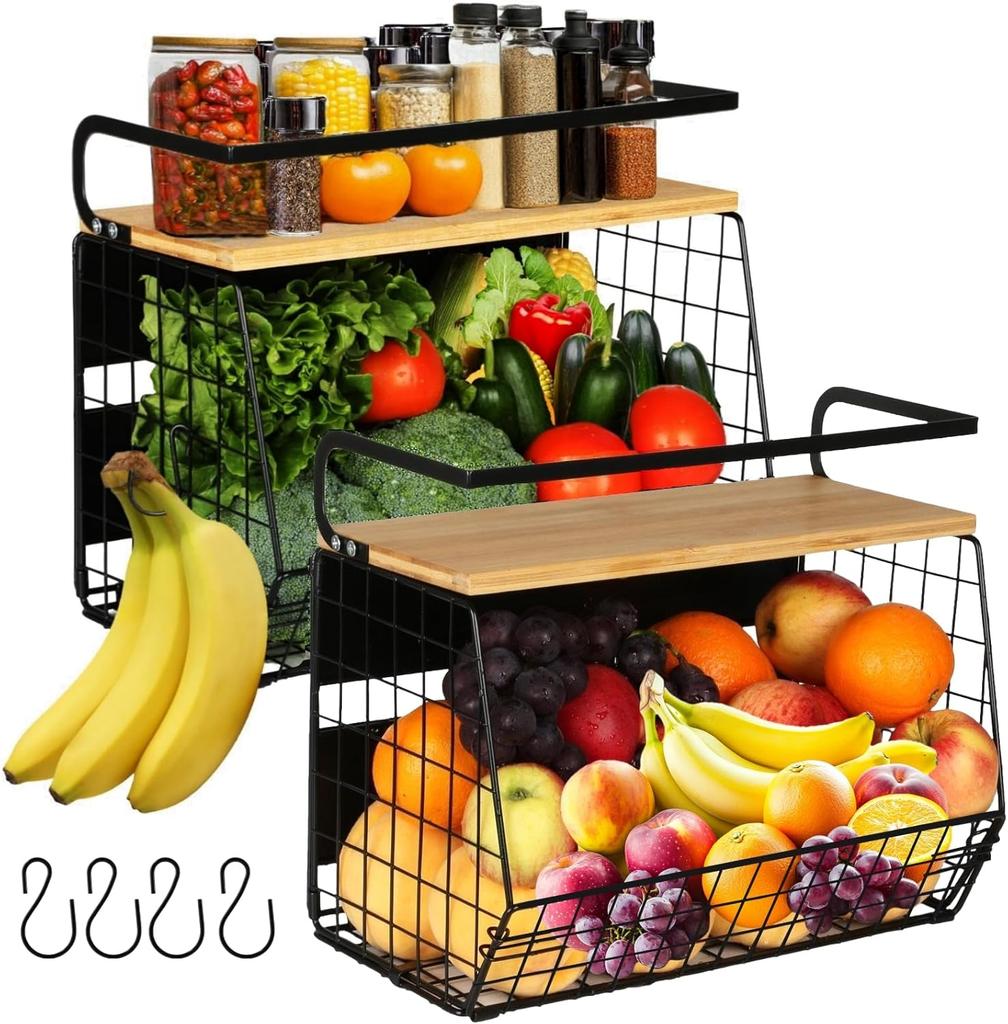 【EASY TO USE AND MOVE】This fruit and vegetable basket has the advantage of not requiring an electric drill for installation. There's no need to test the load capacity of different materials or the distance between two screw holes. The installation process for the 2-tier magnetic refrigerator shelf fruit basket kitchen with wooden lid is simple and straightforward. The kitchen organizers can be moved wherever you want and are easy to clean thoroughly. It is easy to clean thoroughly and offers a smooth storage experience at home. Metal fruit storage basket, fruit basket shelf