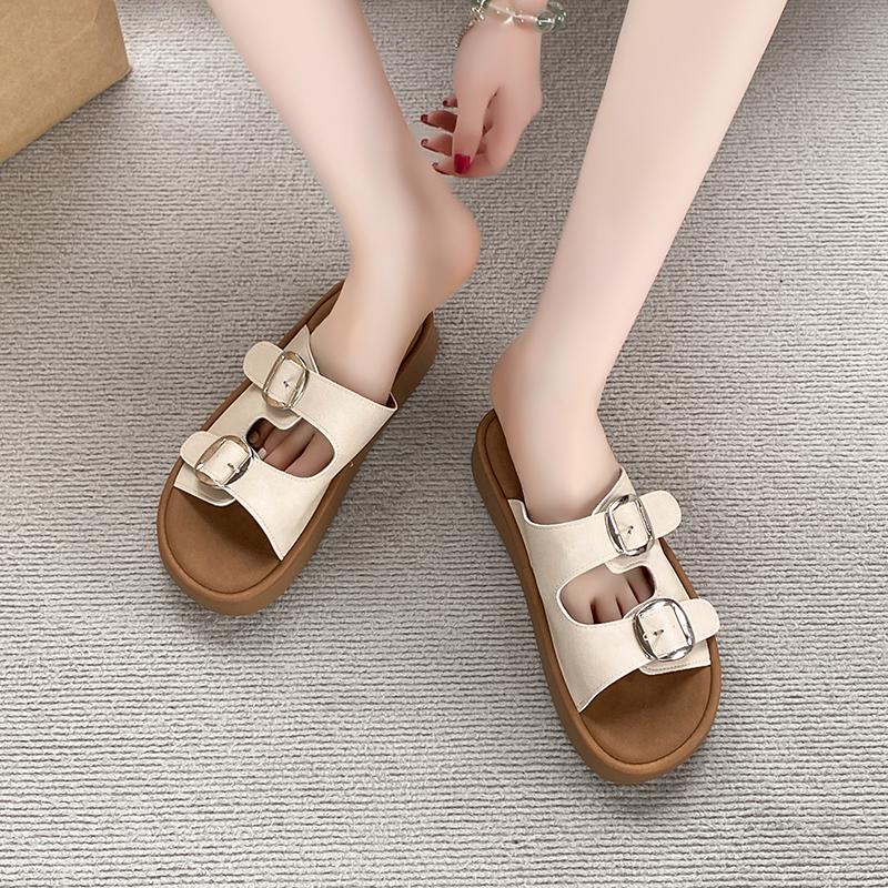 Fashion Flat Platform Slippers Sandals Summer New Round Toe Metal Buckle Outside Wear Heightened Casual Non-slip One-word Beach