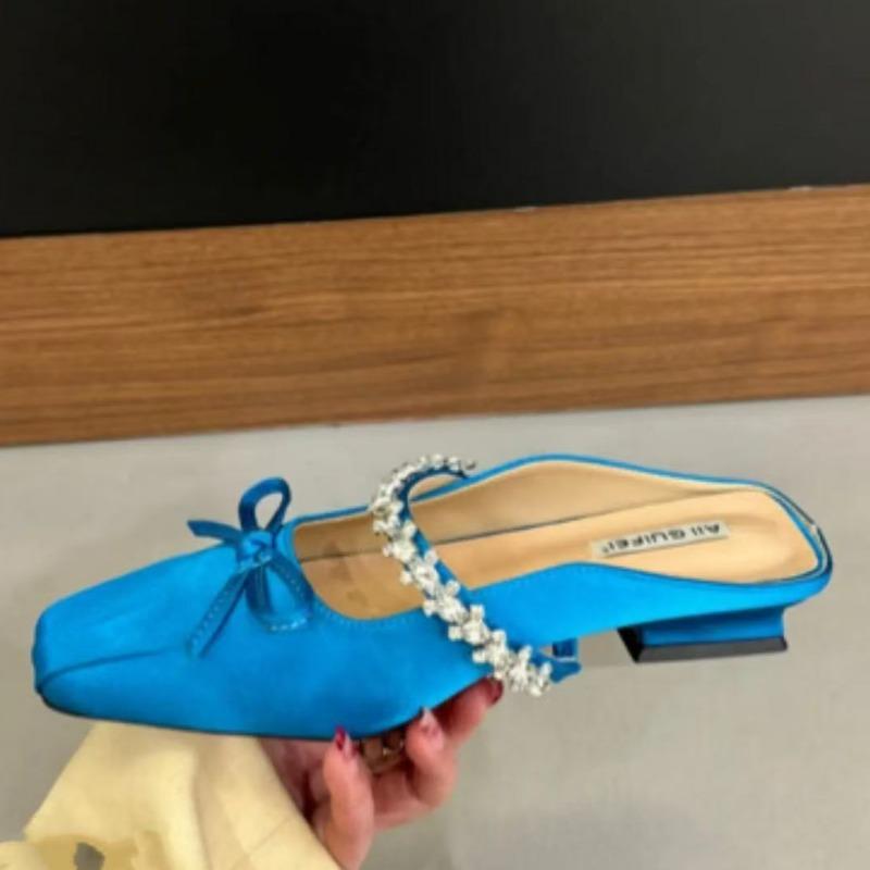 Fashion New Slippers Spring New Square Head Shallow Mouth Flannelette Butterfly Knot Crystal Line with Soft Sole Non-slip Low Heel Shoes