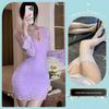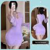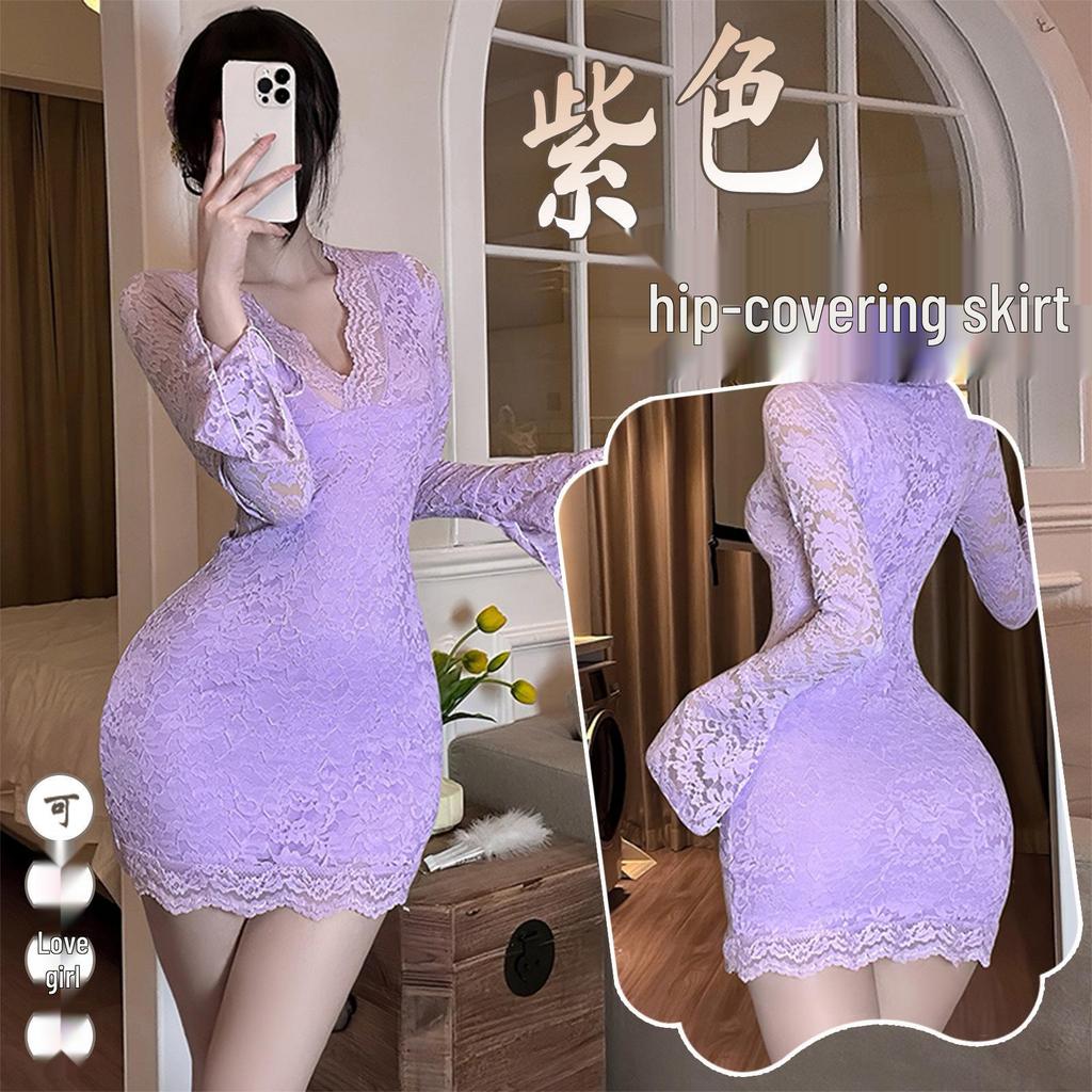 Jin Xiao Sexy French Lace Bell Sleeve Purple Dress with Slimming Waist and Hip-Hugging Design.