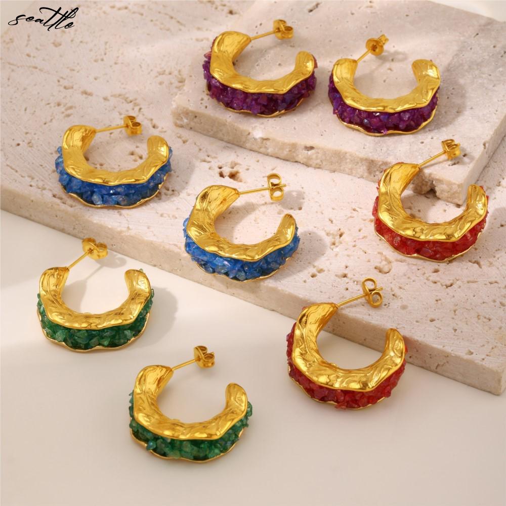 Fashion Colorful Crystal C-shaped Earrings For Women Stainless Steel Gold-plated Luxury Earrings Female Bohemia Zircon Gifts